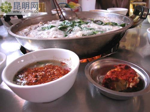 稱得上是一絕,這羊絕對是當地農民飼養的山羊。本地羊肉砍成塊后分別放入油及各種佐料,再加上加入杞子、黨參、淮山、桂圓、紅棗、黃芪等藥膳材料,再加一個蛋白.薄荷和勻調味;加姜絲和蒜段去腥,吃時用火鍋加入燉好的湯底燒開,放入腌制好的羊肉片沸騰即可,末了還可按自己喜好加點青菜或粉絲等火鍋配菜。