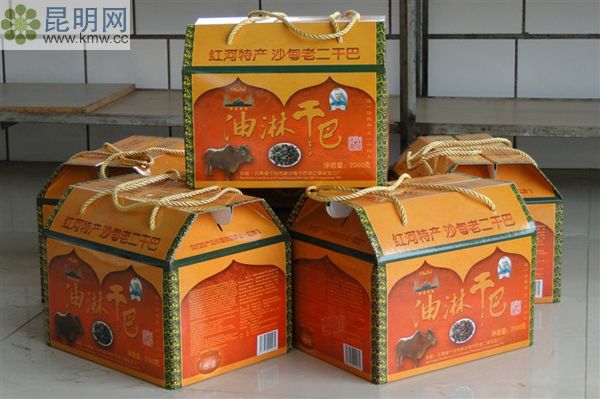 選用自然草場飼養的本地壯黃牛肉,按穆斯林的傳統方法宰后,選擇后腿精肉進行腌制風干,之后把干巴解小,配上作料,用精煉菜油浸炸,起鍋后連油帶干巴一起用建水紫陶罐封裝。干巴肉絲細膩、酥軟、回甜,有韌性但不塞牙。