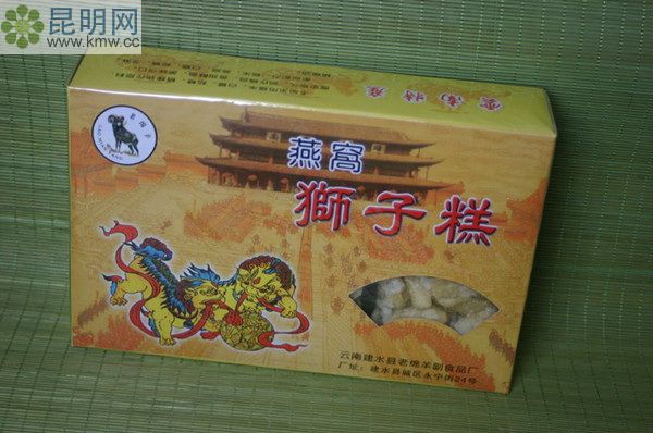 是云南省建水縣的傳統名食。相傳是清代后期,由建水縣榮香齋糕點鋪一吳姓所創制,因糕狀似雄獅頸毛而得名。獅子糕的主要原料為上等糯米、米制飴糖和少量蔗糖。