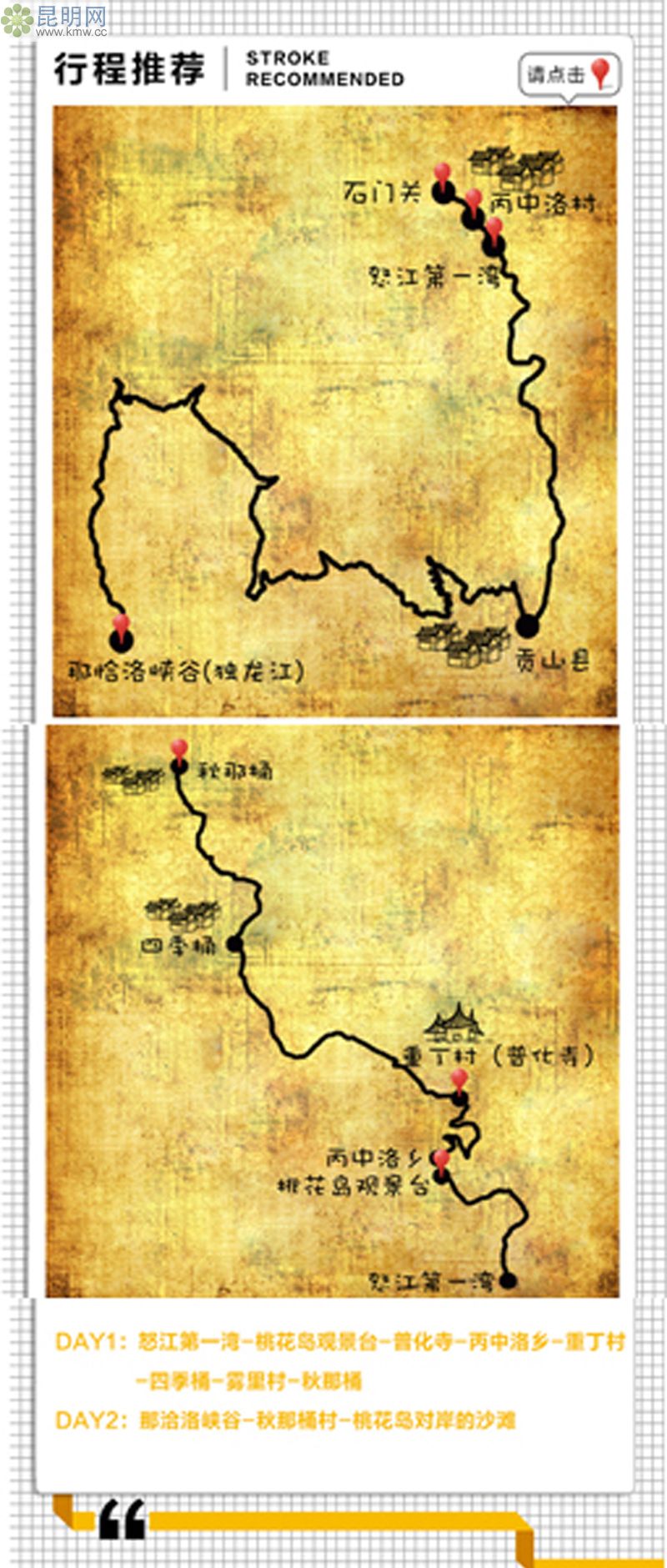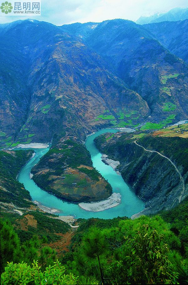 怒江流經云南自貢縣丙中洛鄉日丹村附近,由于王箐大懸巖絕壁的阻隔,江水的流向從由北向南改為由東向西,流過300余米后,有被丹拉大山阻擋住去路,只好再次調頭由西南向東急轉,在這里形成了一個半圓形的大灣,為怒江第一灣。