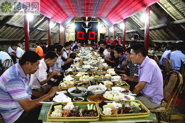 一道“佤王宴”有雞肉爛飯、牛干巴、牛排、烤乳豬、烤雞等10多種美食,再配上醇香的米酒。“佤王宴”過去是佤王酋長宴請18位寨主的宴席,現在到佤山滄源村寨周邊的農家樂就可品嘗到特色的“佤王宴”。你不僅僅在品嘗是饕餮盛宴,也是在品味民族風情。曾在2010年中國佤族司崗里摸你黑狂歡節上創中國世界記錄協會世界最長的宴席紀錄,宴席長度達2270米。
