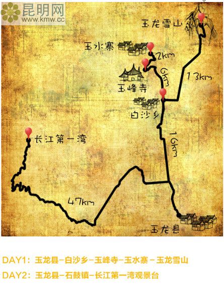 昆明到玉龍縣,約500公里,全程約8小時。途經杭瑞高速G56——南澗路G320——214國道——大麗線S221。過路費165元。