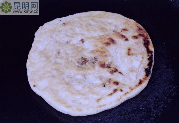 用麗江出產的精細麥面在大理石石板上抹搽植物油,再搟成一塊塊薄片,抹上化油,撒上火腿末或白糖后卷成圓筒狀,兩頭搭攏按扁,中間包入芝麻、核桃仁等佐料,再以平底鍋文火烤熟。