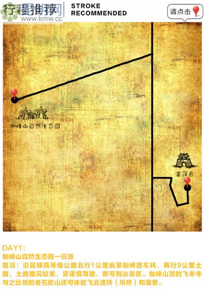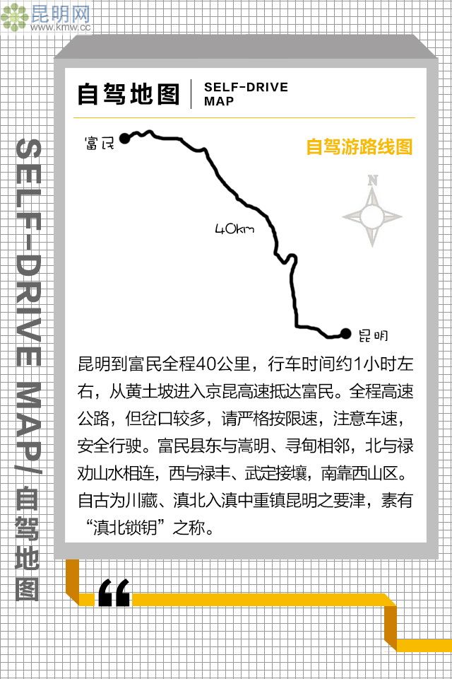 昆明黃土坡轉昆沙路,到普吉走昆祿公路,26公里可達富民。過路費8元。由于正在修高速,偶有堵車,路況尚可。