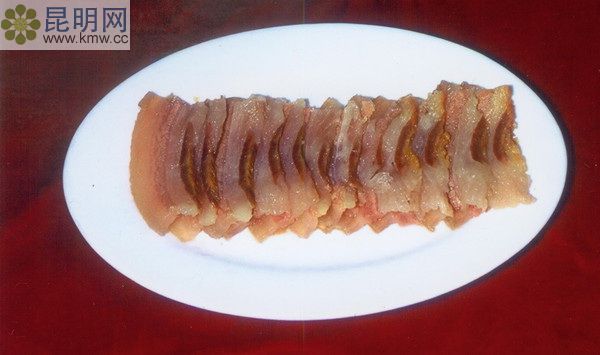 琵琶肉是一種采用藏族傳統的腌肉方法制作的肉食。具體做法是,將豬的內臟和骨取出,保留完整軀體。待稍涼后,放入花椒、草果、食鹽等佐料(也有的加白酒),輕輕搓揉后,將其縫合,壓上石板腌制,還要用木塞或玉米芯把豬鼻塞嚴,以防蟲蛀。因其形狀像琵琶,故稱“琵琶肉”。