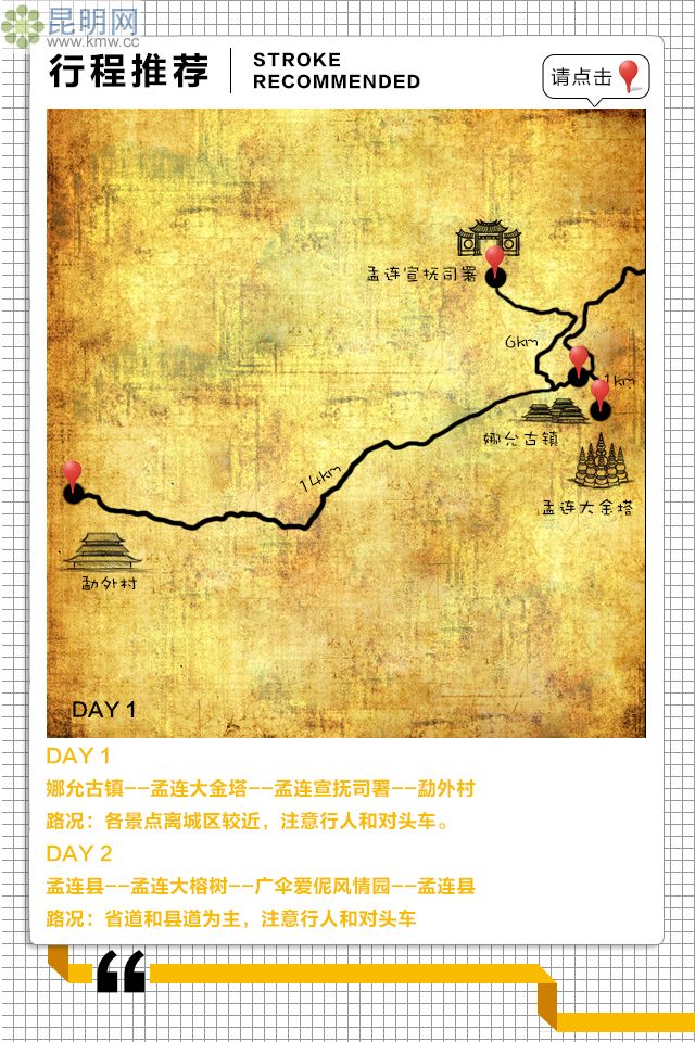 連宣撫司署-6km-娜允古鎮(中城佛寺)-1km-孟連大金塔-16km-勐外村