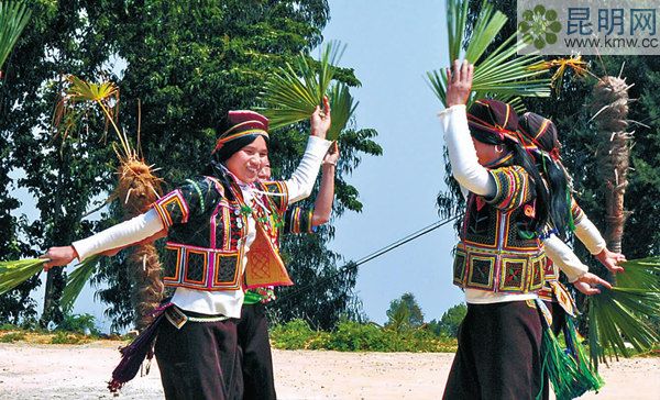 《棕扇舞》是源于哈尼族古代圖騰崇拜的祭祀舞蹈,人們手拿棕櫚葉,充當能為民族帶來吉祥幸福的白鷴鳥羽翼,在具有傣族舒緩、柔美特點的樂曲伴奏下,模擬白鷴鳥在樹下嬉戲、漫步、四處窺探等自然形態。舞蹈動作古樸、細膩,充分表現了哈尼族人民對美好生活的向往。