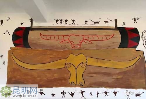 壁畫內容豐富,畫上有古時佤族先民的生活、祭祀、村寨等圖案,還有現代佤族人民的耕種、戀愛、制作木鼓等,畫面生動,色彩艷麗。