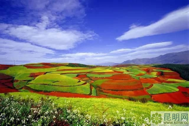火紅的泥土、變色的植物,各異的形狀、優美的線條,襯以藍天、白云和那變幻莫測的光線,東川紅土地就是一副絢爛的變色油畫!