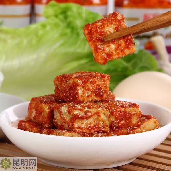 油鹵腐的腌制,以黃豆制成的臭豆腐為主料,臭豆腐要求質地細膩,塊狀均勻,厚薄一致。臭豆腐經陽光照曬,排去外層水分,配以適量的白酒浸裹,再以白糖、精鹽、辣椒、八角、花椒粉等卷在皮層,并滲以煉熟的上好菜油,腌制而成。云南油鹵腐以其色、香、味十足深受省內外群眾的歡迎。